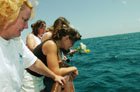 Ceternal26D Fort Lauderdale FL 04/26/04 Sun-Sentinel. Eternal Reefs an Atlanta company buries people's ashes at sea in concret balls to make articial reefs. The company brought 16 peoples ashes in several concret balls to creat a reef . In photo afer dropping a wreath into the sea the four sister paus a minute to remember their brother John Nickles Griffith was 35 when he died L-r Betsy Wilson, Roxana Callow maureen Whittenberg a family friend from Calf, Tracy Simmons and Lisa Salus (not in photo). Staff photo by Lou Toman